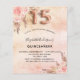 Un arrière - plan d'or rose, rustique et rustique à l'aspect rustique et rustique. Décoré de fleurs roses d'or et de rose, de roses, d'herbe de pampas. Personnalisez et ajoutez un nom et des détails du parti. Le numéro 15 est écrit avec une police de style ballon.