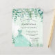 Une invitation branchée pour une Quinceañera, fête du 15ème anniversaire, enchantée thème de la forêt. Un arrière - plan vert à l'eau avec des fougères et de la verdure d'eucalyptus, une robe verte. Le nom est écrit avec un script de style moderne écrit à la main. Personnalisez et ajoutez les détails de votre fête.