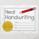 Un certificat de remise de prix en classe pour récompenser les élèves pour leur écriture manuscrite soignée. Arrière - plan est une illustration en papier carnet. Le design comprend également des illustrations d'un crayon rouge et d'un sceau d'or.