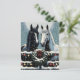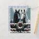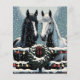 Joli papier craft de Noël pour scrapbooking avec les graphiques d'un cheval blanc et d'un cheval noir debout à une porte en bois décorée de couronnes de fêtes et de jolies lumières de Noël scintillantes recouvertes de neige. Ces chevaux sont réalisés dans un style pop art de bande dessinée pour évoquer une sensation nostalgique.