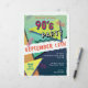 Circulaire sur le thème de la fête des années 90 avec une typographie amusante de "la fête des années 90". Le design comprend des éléments de bleus, d'oranges et de roses, de jaunes, de bords arrachés, de motifs géométriques et de formes inspirées des années 90. Inclut un modèle pour la personnalisation personnelle.