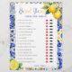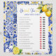Apportez le charme et l'élégance de la côte d'Amalfi à votre douche nuptiale avec notre jeu "He Said, She Said", magnifiquement conçu avec des carreaux bleus Amalfi complexes. Ce jeu enchanteur ajoute une touche de sophistication méditerranéenne, célébrant l'histoire d'amour de la mariée et du marié d'une manière amusante et engageante. Caractéristiques : Design élégant : Les cartes de jeu présentent un magnifique motif Amalfi Blue Tile, présentant des motifs complexes et de riches tons bleus inspirés des magnifiques tuiles de la côte amalfitaine. Ce design apporte une touche d'élégance et de charme méditerranéen à votre événement. Facile à jouer : Chaque carte est remplie de déclarations amusantes et intrigantes sur le couple. Les clients doivent deviner si chaque déclaration a été faite par la mariée ou le marié. Parfait pour déclencher des conversations et des rires ! Utilisation polyvalente : Idéal pour les douches nuptiales, les fêtes de fiançailles, ou même comme un brise-glace amusant à la réception de mariage. Comment jouer : Distribuez une carte de jeu et un stylo à chaque invité. Lisez chaque déclaration et devinez si elle a été dite par la mariée ou le marié en marquant la case correspondante. L'hôte lit les réponses correctes à partir de la clé de réponse incluse. L'invité avec les réponses les plus correctes gagne un prix! Pourquoi Choisir Nos Carreaux Bleus Amalfi Il A Dit, Elle A Dit Fête des mariées Game? Ce jeu est plus qu'une simple activité ; c'est une façon de réunir amis et famille, de partager le rire et l'amour tout en honorant la mariée et le marié. Le thème Carrelage bleu Amalfi ajoute une touche de sophistication méditerranéenne, ce qui en fait un complément parfait à toute décoration de douche nuptiale. Célébrez l'amour, le rire, et heureux toujours après avec notre Amalfi Blue Tiles He Said, She Said Fête des mariées Game. C’est la façon idéale de créer des souvenirs durables et de faire la joie de votre journée spéciale!