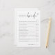 Brisez la glace avec ce jeu "How Well Do You Know the Bride ?" qui invite les invités à répondre aux questions sur la mariée et à évaluer leur nombre correct. Utilisez l'outil de conception pour customiser les questions si vous le souhaitez ou modifier les couleurs pour correspondre à votre thème de douche nuptiale.