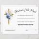 Beau Certificat de Prix Catholique pour Récompense pour de nombreuses utilisations. Idéal pour les écoliers, les classes de catéchisme, les évènements religieux, etc., La belle image du Saint-Esprit et des fleurs bleues sont superposées sur une croix d'or. Tout le texte et les polices peuvent être modifiés. Acheter en gros pour des rabais plus importants!