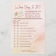Ce jeu amusant de douche nuptiale va tester comment vos invités connaissent la mariée et le marié. Les clients doivent deviner si chaque objet fait partie de l'histoire de la mariée, du marié ou des deux. Le jeu est entièrement personnalisable pour que vous puissiez entrer vos propres objets ou utiliser ceux que nous avons fournis. L'oeuvre couleur rose vif et pêche comprend une jolie aquarelle d'un anneau fiançailles équilibré dans les pages d'un livre ouvert formant une ombre en forme de coeur avec une rose rose rose à proximité. Parfait pour une douche de mariée à thème livre !