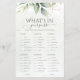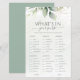 Ajoutez une touche ludique à votre célébration mariage avec ce jeu personnalisable "What's in Your Purse ?" ! Doté d'une belle aquarelle aux accents verts et dorés, ce jeu vous permettra de divertir et de deviner vos invités. Personnalisez le jeu avec vos idées pour créer un souvenir unique pour votre journée spéciale. Parfait pour les douches nuptiales, les dîners de répétition ou les réceptions de mariage, ce jeu est une façon amusante et interactive de célébrer avec vos proches.