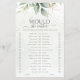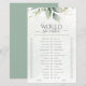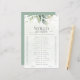 Ce charmant jeu "Will She Plent" présente un design délicat de verdure d'eucalyptus et des accents d'or doux, créant une atmosphère chic et élégante pour votre douche nuptiale. Le jeu comprend une série de questions ludiques et provocantes qui déclencheront le rire et la conversation entre vos invités alors qu'ils essaient de prédire les préférences de la mariée. Avec son design magnifique et son format interactif, cette carte d'activités festives amusantes sera certainement un ajout inoubliable à votre célébration de la douche nuptiale.
