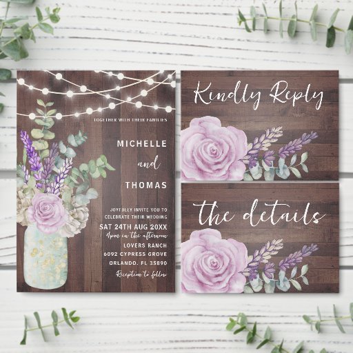 Magnifique conception d'inspiration rustique incorporant des illustrations originales de roses, de lavande et d'eucalyptus dans un pot Mason vintage. Des éléments artistiques et des guirlandes lumineuses sont sur un fond en faux bois avec une calligraphie en blanc.