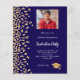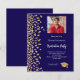 Une invitation moderne et élégante à Graduation Party. Un arrière - plan bleu foncé décoré de faux confettis d'or. Personnalisez et ajoutez une photo, un nom et des détails de la fête. Texte blanc. 1 feuille = 1 invite imprimé bord à bord.