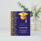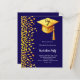 Une invitation moderne et élégante à Graduation Party. Un arrière - plan bleu foncé décoré de faux confettis d'or et une grande casquette de graduation dorée avec goût. Personnalisez et ajoutez un nom et des détails du parti. Texte blanc. 1 feuille = 1 invite imprimé bord à bord.