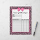 Faites passer votre commande facilement avec ces formes de commande empreintes de léopard roses et noires mignonnes et tendance, ornées de rubans roses chauds et ceinturés dans un joli arc. Personnalisez en ajoutant le nom de votre magasin ou de votre boutique en ligne. Ces modèles de bons de commande élégants ont une place pour une description de produit, la quantité et le prix de vente. Image imprimée plate, pas le ruban réel.