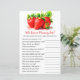 Faites de votre baby shower un plaisir supplémentaire avec cette fraise "Qui connaît maman le mieux ?" Jeu ! Ce jeu interactif et divertissant met les clients au défi de voir qui connaît la maman-to-be le meilleur. Doté d'une décoration sur le thème de la fraise, il est parfait pour un baby shower de baies ou une fête d'été. Les clients pourront s'amuser en répondant à des questions amusantes sur Olivia, ce qui en fera une partie inoubliable de votre événement. Imprimé sur papier de haute qualité, il est facile à utiliser et parfait pour tous les réglages de fête. Ajoutez un peu de rires et de compétition amicale à votre journée spéciale avec ce jeu de baby shower charmant!