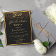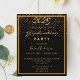 Une invitation moderne et élégante pour une fête de remise de diplômes.Pour lui et elle. Glamour avec arrière - plan noir élégant et moderne et pluie de confettis dorés. Avec un cadre en faux or. Modèle pour le nom et les détails de la fête. Le texte Graduation et le nom sont écrits avec un script de style manuel moderne. Lettres d'or. Dos : couleur arrière - plan noire, confetti