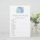 Ce jeu de douche nuptiale est un mot mariage scramble avec 12 mots à débrider. Il présente un design floral hydrangea bleu aquarelle. Personnalisez le texte sur le dos avec le nom de la mariée. Fournitures de douche de mariée assorties disponibles.
