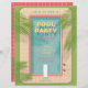 Pool Party Flyer avec piscine illustrée dans un style moderne du milieu du siècle. Les décors comprennent des éléments de blues et de roses, des frondes en feuilles de palme, une piscine et un design rétro.