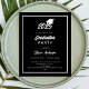 Une invitation moderne et design à la remise des diplômes. Pour lui et elle. Arrière - plan noir, texte blanc et cadre. Une casquette blanche de graduation. 1 feuille = 1 invite imprimé bord à bord.