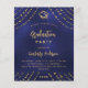 Un fond bleu marine orné d'étoiles dorées factices et d'une casquette. La couleur bleue est irrégulière. Personnalisez et ajoutez un nom, les détails de la fête et l'année. Le texte Remise de diplôme et le nom sont écrits avec une police de caractères manuscrits moderne. 1 feuille = 1 invitation imprimée de bord à bord.