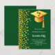 Une invitation moderne et élégante à Graduation Party. Un arrière - plan vert émeraude décoré de faux confettis d'or et d'une grande casquette de graduation dorée avec goût. Personnalisez et ajoutez un nom et des détails du parti. Texte blanc. 1 feuille = 1 invite imprimé bord à bord.