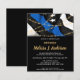 Petite Ligne Bleue Police Invitations de Graduation. Célébrez votre nouveau diplôme de l'académie de police, ainsi que vos amis et votre famille invitations à votre fête de graduation de policier avec cette Invitation de graduation de la police de la Ligne Bleue Mince. Etats-Unis Drapeau américain dans les couleurs Police Drapeau, moderne tendance noir blanc et bleu avec des lampes à cordes d'or design. Cette invitation à l'obtention du diplôme d'officier de police est également parfaite pour les invitations à la retraite de la police, lieu de changement dans la personnalisation. Consultez notre collection pour obtenir des cadeaux de remise de diplômes de police, des faveurs de remise de diplômes de l'académie de police et des fournitures. DROIT D'AUTEUR © 2021 Judy Burrows, Black Dog Art - Tous droits réservés. Invitation de la partie de graduation de l'officier de police budgétaire