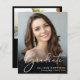 Célébrez les réalisations de votre diplômé avec cette élégante faire-part de graduation noire et une invitation à la fête. Sa photo préférée remplit la carte de "Graduate" superposée sur le dessus dans un élégant script blanc ; en dessous, ajouter son nom, l'école et l'année de classe. Au verso, ajoutez une photo supplémentaire et les détails de votre fête de remise de diplômes en lettres blanches simples.