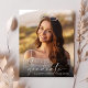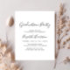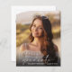 Élégante invitation à la fête de remise des diplômes avec la photo de la grad superposée avec "gradué" dans un script blanc moderne et leur nom et année de classe dans une simple typographie blanche. Au contraire, ajoutez les détails de la fête principale.