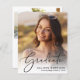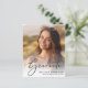 Célébrez les réalisations de votre diplômé grâce à cette élégante faire-part de remise de diplômes et à l'invitation de la fête, qui est à la portée du budget. Sa photo remplit la carte, superposée de "Graduate" dans un script élégant ; en dessous, ajouter son nom, l'école et l'année de classe. Au verso, ajoutez une photographie supplémentaire et une fête de remise de diplômes ou des détails de la maison ouverte.