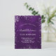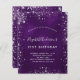Une invitation moderne, élégante et glamour pour une fête d'anniversaire de 21e (ou tout âge). Un arrière - plan de couleur violet foncé avec de la poussière de parties scintillant en faux argent. La couleur violette est inégale. Le nom est écrit avec un script de style moderne écrit à la main. Personnalisez et ajoutez les détails de votre fête.
