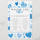 Faites du shower de la 'future maman' un moment inoubliable avec ce jeu 'préfèrerait-elle...' amusant et adorable ! Le design présente des illustrations aquarelles de cœurs bleus avec différents motifs.