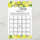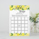 Ajoutez une touche piquante à votre fête de mariage avec notre jeu de Bingo pour fête de mariage estivale au citron, exclusivement disponible sur Zazzle ! Parfait pour une réunion estivale, ce jeu de bingo présente des motifs de citrons vibrants et ensoleillés qui apportent une ambiance rafraîchissante à votre célébration. Chaque carte est ornée d'illustrations uniques sur le thème du citron et d'éléments classiques de fête de mariage, garantissant que deux parties ne soient jamais identiques. Facile à personnaliser et amusant à jouer, ce jeu gardera vos invités divertis et engagés alors qu'ils s'affrontent pour crier "Bingo !" Profitez d'une journée mémorable remplie de rires et de compétition animée - idéal pour toute future mariée qui aime une touche de charme d'agrumes !