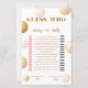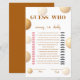 Cette conception a été inspirée par des ballons dorés doux flottant autour d'une joyeuse célébration. La palette neutre chaude et la mise en page moderne et épurée donnent à cette carte de jeu une sensation élégante, en faisant un moyen amusant et stylé pour les invités de deviner qui a dit quoi - maman ou papa.