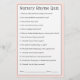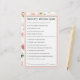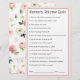 Une idée mignonne comme un jeu de baby shower, ce jeu de questions et réponses présente des questions bien-aimées de rime de pépinière. Chaque client reçoit une fiche de jeu et remplit ses réponses. Une fois les réponses complétées, l'hôte ou l'interlocuteur du jeu appelle les questions et fournit les réponses correctes. L'invité avec les réponses les plus correctes gagne un prix! Ce design en rose vif avec un motif floral sur le dos se coordonne avec une collection de baby showers "bébé en fleur" dans ce thème floral rose. Voici les réponses aux questions sur la carte de jeu : 1. Tarte de Noël. 2. quatre et vingt. 3. un morceau de poivrons marinés. 4. boucher, boulanger, bougeoir. 5. pleine de grâce. 6. un poney. 7. pour aller chercher un seau d'eau. 8. les embrassèrent. 9. la femme de l'agriculteur. 10. un os. 11. son souper. 12. un piéman. 13. cloches en argent, roulettes de coques, jolies domestiques toutes dans une rangée. 14. un porc