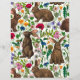 Lapins et flore boisée dessinés à la main, fougères, champignons, beriies et insectes