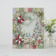 The design features a vibrant patchwork border of floral, damask, and plaid patterns in shades of green, red, and cream, with subtle gold accents. The soft, snowy center is framed by striking red and white poinsettias and lush foliage.
