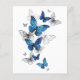 Vliegende Blauwe Butterflies morpho en witte vlinders op een lichte abstracte achtergrond. Morpho. Ontwerp met blauwe vlinders morpho.