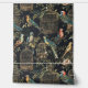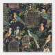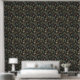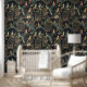 Papier peint élégant avec illustrations vintages de cages d'oiseaux dorés et d'oiseaux bleus, rouges et oranges sur un arrière - plan noir.