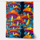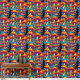 Champignons vintages colorés et vibrants avec un motif psychédélique en bleu, orange et jaune.