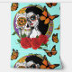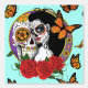 Un crâne à sucre est assis derrière une femme portant un jour le maquillage du crâne à sucre mort sur le tout dessiné dans un style Art nouveau.