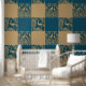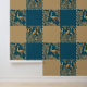 Cet élégant papier peint présente un motif de grands carrés, avec des motifs de paons détaillés en bleu et faux or, entrecoupés de carrés ordinaires de bleu et d'or. Le motif dans son ensemble a un aspect plaid, tandis que les détails complexes fournissent profondeur et intérêt de près.