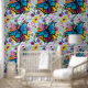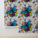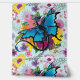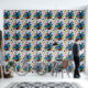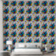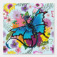 Dragon bleu et noir aux ailes papillon niché au milieu d'un bouquet de fleurs colorées sur fond de bleu clair.