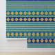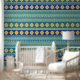 Elégant mélange de bleus et jaunes marocains et rayures vertes dans un motif horizontal qui fera qu'il est super facile de faire correspondre les rouleaux et aussi rendre votre mur plus large. Ce design est une vision unique des formes marocaines Alternatives bandes vertes sont plus apaisantes et moins "occupées" que d'utiliser des formes marocaines à elles seules