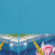 Une jeune fille mignonne dérive doucement sur un char à licorne rose et blanc, glissant à travers une piscine bleu cristalline.