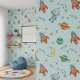 Launch into an intergalactic adventure with this vibrant wallpaper! This delightful pattern features cheerful, hand-drawn astronauts waving hello, bold red and orange rocket ships blasting off, friendly smiling moons, colorful striped planets, and twinkling stars. All these elements float across a soft, speckled blue background.. Perfect for inspiring dreams of exploration, this fun, gender-neutral design is ideal for a boy's bedroom, a play area, or a nursery, bringing a sense of wonder and excitement to any aspiring space explorer's room. Search ID1232 to see products with this fun pattern. Note: design adapted from generative content.