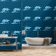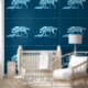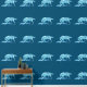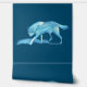 Un loup bleu stylisé (Canis lupus) projette une ombre en traversant un terrain enneigé.