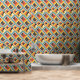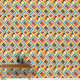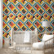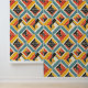 Cette oeuvre présente un motif dynamique et texturé de formes chevrons et triangulaires disposées en mosaïque audacieuse. Le design présente une palette de couleurs vives mais terreuses, turquoises, jaune moutarde, rouge et noir, dressées contre un arrière - plan crème. Le motif est affligé de rayures subtiles et de textures rugueuses, lui donnant un aspect rustique et usé. L'agencement géométrique crée un sens du mouvement et de la profondeur, tandis que les lignes audacieuses et les couleurs contrastées évoquent un sens de l'énergie et de la vitalité, rappelant les textiles vintages et les motifs artisanaux.