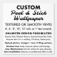 Modèle vierge personnalisé Peel et Papier peint en vinyle texturé (2' x 12' roll). Design, votre propre fond d'écran pour un mur avec accent ou une chambre entière, des rouleaux de 2' de large avec cinq options de longueur de rouleau jusqu'à 12' de long, plus une nuance d'essai. Faites votre propre papier peint en vinyle lisse ou en vinyle texturé sur mesure pour créer un espace de vie unique, un papier peint à thème de chambre pour enfants, un décor maison sur mesure ou un commerce de détail de marque, bar, café, restaurant, hospitalité ou environnement de bureau. Ce papier peint personnalisé et de haute qualité est conçu pour faciliter le nettoyage et l'entretien, et rend la décoration personnalisée parfaite pour Noël, une douche bébé, un mariage, une fête à thème, un événement d'entreprise ou toute autre occasion spéciale. Personnalisez en téléchargeant une photo, un logo ou un design, et ajoutez du texte. Utilisez l'édition personnalisée pour mosaïque d'un motif avec cinq options de carrelage alternatives. Ajoutez votre logo et votre marque pour une utilisation commerciale et d'entreprise.