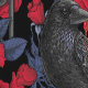 Design motif peint à la main avec corbeau perché sur une clôture métallique avec une clé sur un ruban dans ses factures et roses rouges