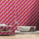 Floral illustration wallpaper design. Pink, orange and off-white, hand-drawn flowers appear diagonally in this pattern. Shown over a rich, dark chocolate brown background color. Perfect for giving a room a colorful, retro, vibe.