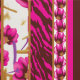 Le design semble être un design pour un vêtement, peut-être une robe ou un tissu traditionnel. Voici une description détaillée : ・ Section supérieure : présente un motif floral avec des fleurs roses et des feuilles verts sur un arrière - plan blanc. Le décolleté est orné de motifs roses et or. ・ Bande médiane : Contient un poster de animal rose et blanc, bordé de deux fines bandes dorées. ・ Section inférieure : Répète le motif poster de animal de façon intensive. La combinaison de fleurs et de posters de animaux crée un énoncé de mode dynamique et audacieux, peut-être pour les vêtements culturels.
