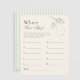 Profitez de cette superbe douche à nage Perfect Pear Where Are They, qui propose des poires dessinées à la main, des accents de verdure et une élégante typographie de script. Une activité ludique qui incite les clients à deviner où se trouvait le couple dans différents moments, ce jeu de douche à thème poire ajoute du rire et de l'interaction à votre événement. Idéal pour les douches rustiques, les douches à la ferme ou les douches d'inspiration jardin, cette carte d'activité de douche nuptiale se marie harmonieusement avec des invitations, des panneaux et un décor poire assortis.