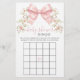 Sophisticated classic "Bingo" game designed for a baby girl shower, adorned with a charming blush pink coquette bow surrounded by pink spring summer flowers. Engage your guests with this delightful game, perfect for adding fun and excitement to your winter celebration while creating cherished memories.